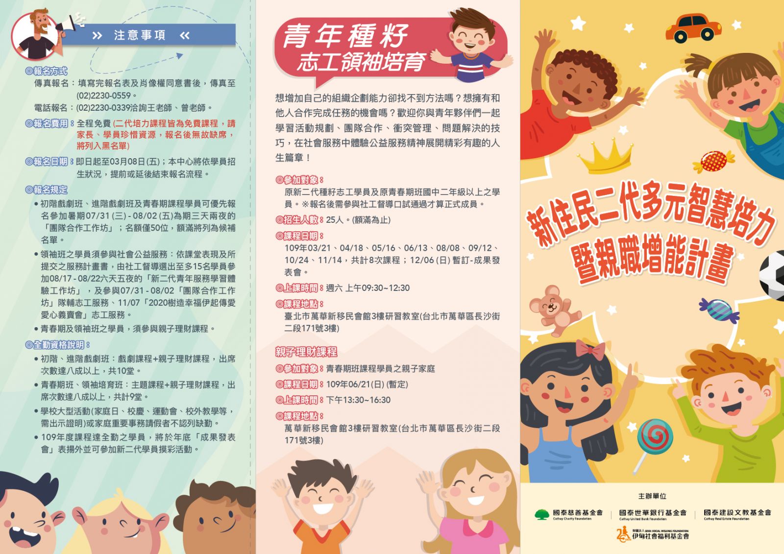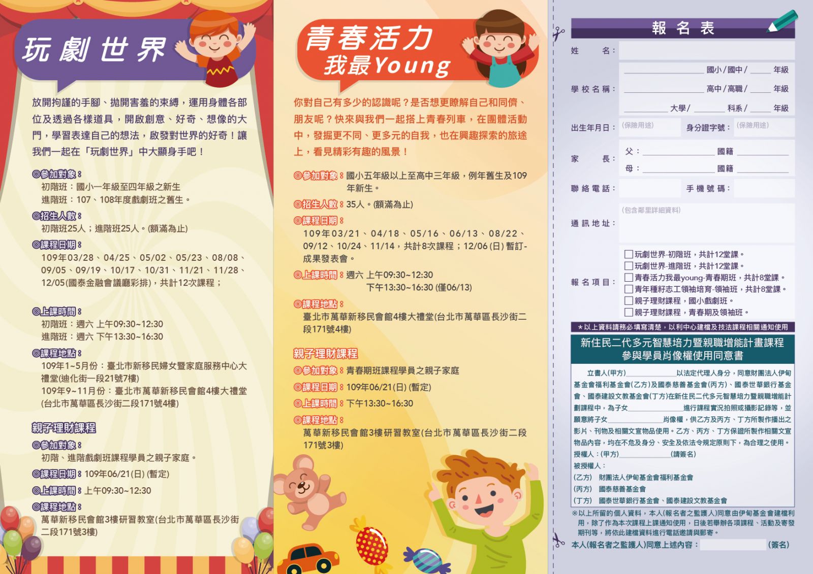 針對不同年齡層規畫與設計專業課程:包含玩劇世界(戲劇初、進階班)、青春我最Young(青春期班)、種籽志工領袖培育班及親子理財等,帶領更多新二代提升自信與發揮優勢!即日起至6月30日止,歡迎國小、國中之二代青少年踴躍報名參加!相關課程資訊及報名,可下載活動簡章1、簡章2或來電洽詢(02)2230-0339王老師、曾老師。
