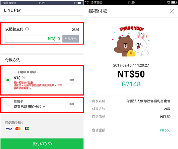 可使用LINE POINTS 1點抵1元折抵支付、LINE Pay Money (原一卡通帳戶)、信用卡 → 完成捐款