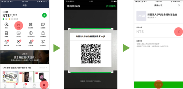 進入「錢包」頁面並 → 點選「掃描」→ 掃描『零錢箱』上QR Code → 自行輸入捐款金額
