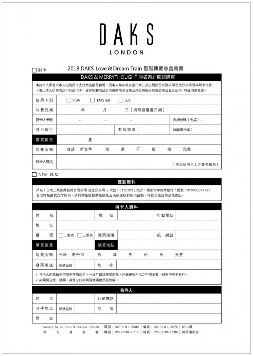 2018年的慈善限量手工泰迪熊義賣限量100隻,每隻均有編號,義賣所得DAKS將全數捐予伊甸「象圈工程計畫」服務使用,讓更多的孩子能在你我的守護下,快樂及幸福的成長。歡迎有興趣的民眾至全省DAKS女裝專櫃及高雄漢神巨蛋2F旗艦店洽詢,或直接下載訂購單,填妥後傳真至02-8230-1208,活動來電請洽02-2230-7715分機5319吳小姐。