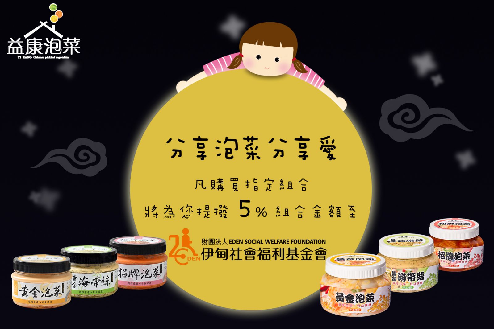 吃泡菜傳承愛,一塊暖心過中秋!益康為響應伊甸「弱勢兒童服務計畫」,幫助慢飛天使健康長大,即日起至9月24日止,凡於益康官網上購買「限定組合商品」,包含小黑瓶3入組、大白瓶3入組、大白瓶6入組,每款將提撥售價金額的5%給伊甸基金會,作為發展遲緩兒早期療育的服務經費。歡迎大家踴躍團購,讓今年的中秋節格外有意義,相關活動詳情,請上益康官網,或電洽(03)4947341#142陳小姐。
