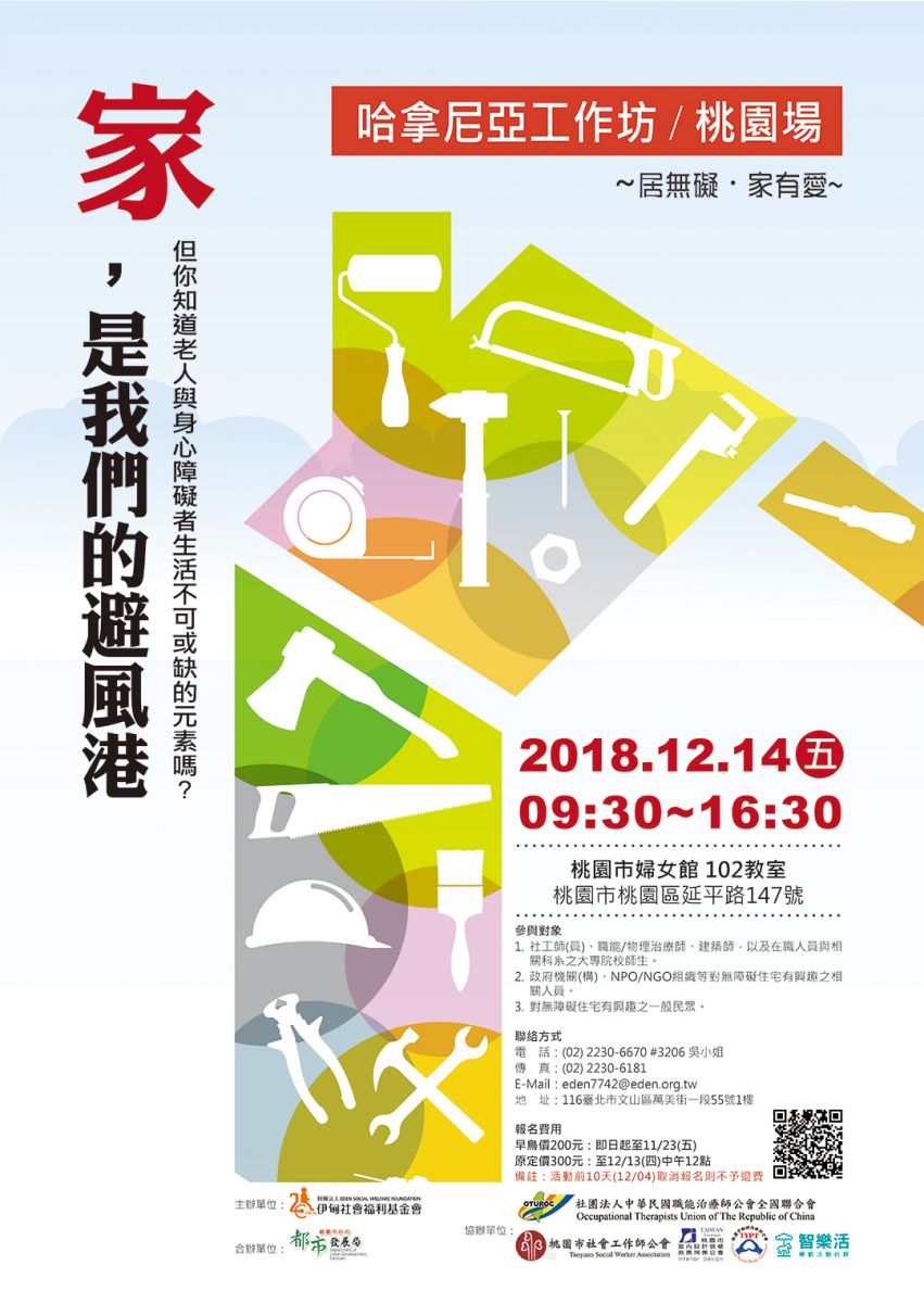報名方式:12/13(三)12:00 前,請至 https://bit.ly/2D0wm93 完成線上報名,並於三個工作日內至ATM或郵局劃撥繳費 (帳號:19998559、戶名:財團法人伊甸社會福利基金會,註明:107年度哈拿尼亞工作坊-桃園場),劃撥後,請 E-Mail:eden7742@eden.org.tw 繳款收據影本。