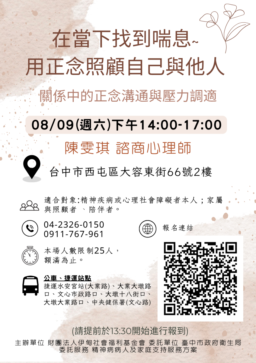 伊甸基金會中區服務中心8月9日(六)下午14:00-17:00將舉辦「在當下找到喘息-用正念照顧自己與他人」講座,透過專業諮商心理師,認識正念,為何正念適用於精神疾病與照顧關係中的壓力管理、正念練習體驗與自我調節、關係中的正念溝通與自我照顧。歡迎報名參加。
