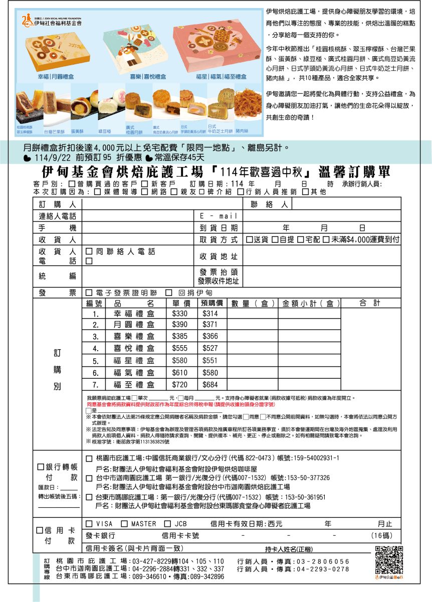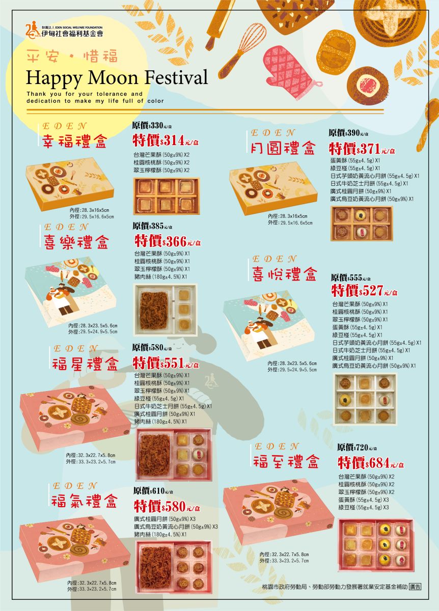 中秋月圓,家人們相聚一起,在月光下享美食、聊生活,無疑是人生一大樂事。邀請您支持,分享這一份幸福,讓身心障礙者的生命,能綻放希望的光,使他們自立生活的夢想,得以逐步實踐。即日起至9/22前訂購,還能享95折早鳥優惠,敬請把握機會!