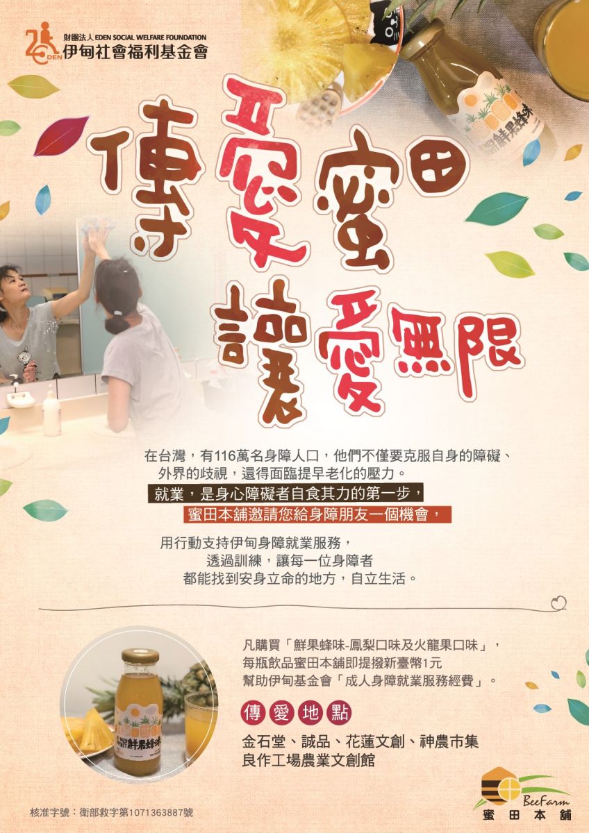 為了幫助身障青年打造圓夢舞台,在職場上成功就業,蜜田本舖首度與伊甸基金會合作舉辦「傳愛蜜田 讓愛無限」公益活動。即日起至12月底止,民眾凡購買「鮮果蜂味-鳳梨口味及火龍果口味」,每瓶蜜田本舖即提撥新臺幣1元支持伊甸基金會「成人身障就業服務經費」。