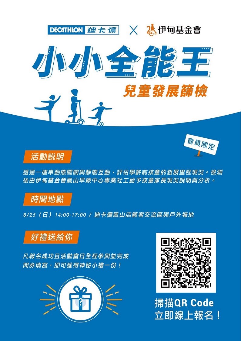 由伊甸基金會及迪卡儂鳳山店合辦的「小小全能王-兒童發展篩檢」,8/25(日)下午2-5點提供免費諮詢及幼兒兒童發展篩檢闖關遊戲,歡迎家長帶寶貝一起參加!闖關成功還可獲得迪卡儂贈品耶!活動資訊洽07-315-9666轉103,伊甸基金會與您一同關心寶貝的健康與發展!