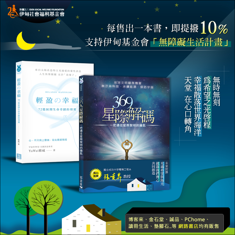 即日起至12/31止,凡於各通路(三民、博客來、金石堂、讀冊生活、PChome、誠品、讀冊電子書)購買指定書籍「369星際解碼」及「輕盈的幸福」任一本,耶書雅文化有限公司即提撥10%響應伊甸基金會「無障生活計畫」,支持身心障礙者突破身體的侷限,重拾自立生活、實現自我價值!支持購買請上耶書雅網站或來電請洽:02-2230-7715分機5312姚先生。