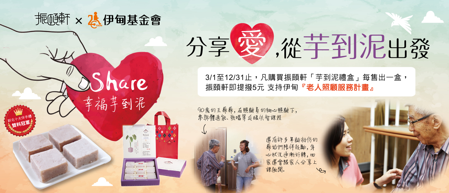 即日起,凡於振頤軒官網或門市購買「芋到泥」禮盒,每售出一盒,振頤軒即為您提撥5元支持伊甸「老人照顧服務計畫」,讓銀髮寶貝們的老年生活,擁有尊重、尊嚴及尊榮”三尊”的晚年生活。購買及門市查詢請上振頤軒官網,或來電請洽(02)2230-7715分機5312 呂小姐 。