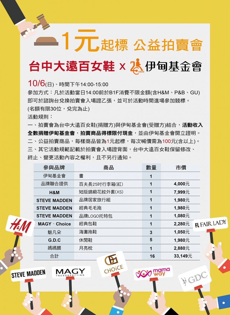 10月6日(星期日)下午14:00-15:00,台中大遠百女鞋將舉辦「1元起標 公益拍賣會」,活動收入將全數捐給伊甸基金會,凡在活動當日14:00前於B1F消費不限金額(含H&M、P&B、GU)即可於諮詢台兌換拍賣會入場證一張,並可於活動時間進場參加競標,活動名額有限,兌完為止)。詳情請洽:04-2235-1115,分機23林先生。