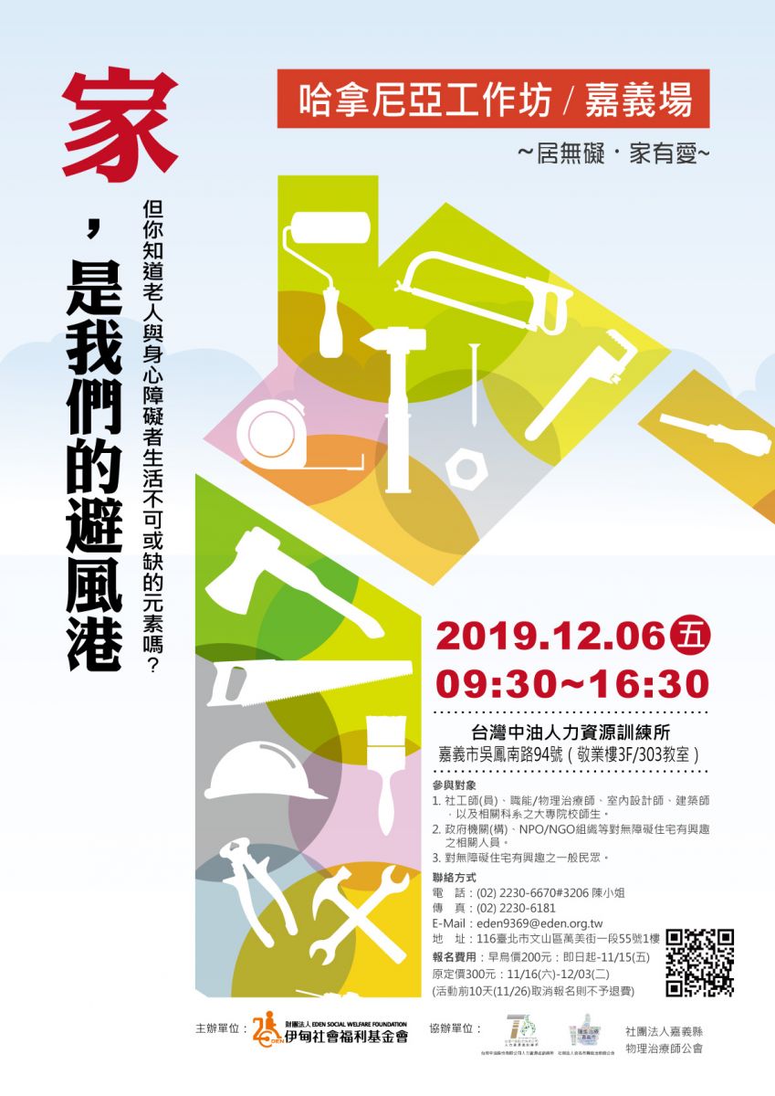 即日起,歡迎物理治療師、室內設計師、建築師、及對無障礙住宅、通用設計有興趣的社會大眾,至線上報名參加《108 年度哈拿尼亞工作坊-嘉義場》;11/15前報名還可享有早鳥優惠價200元,報名費用除含團體保險、午餐、講義費用,還可獲得市價320元《居無礙 家有愛》書籍乙本。課程詳情歡迎下載報名簡章或來電請洽:(02) 2230-6670分機3206陳小姐。